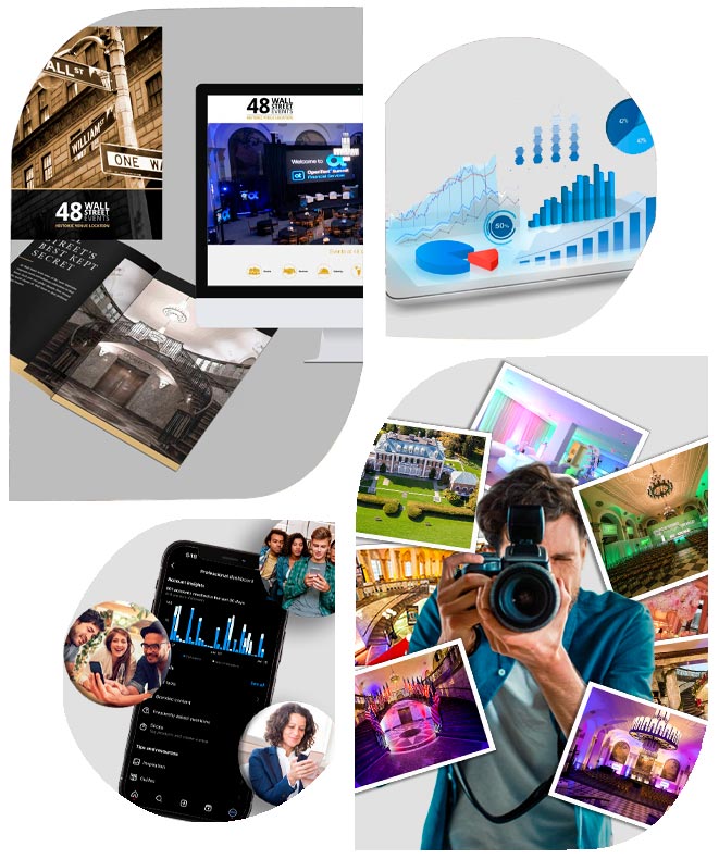 We are equipped with a talented in-house team of graphic designers and web developers, ready to elevate your venue’s presence. Our team offers a diverse range of marketing and event services designed to attract and engage potential clients.